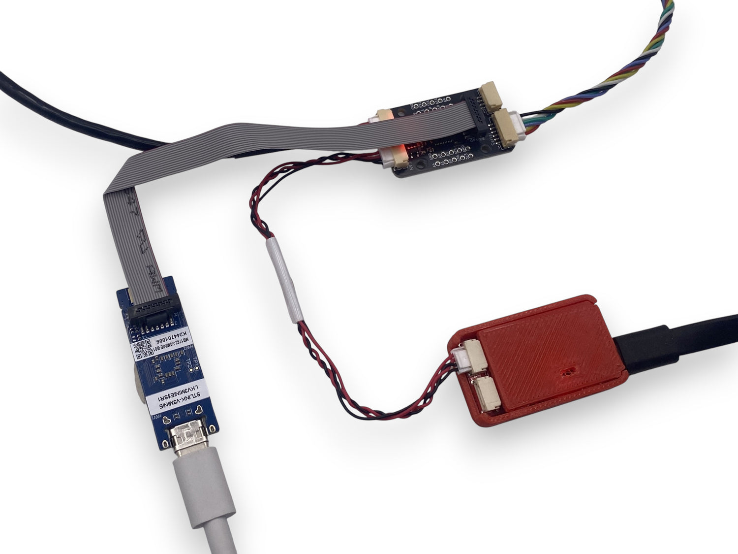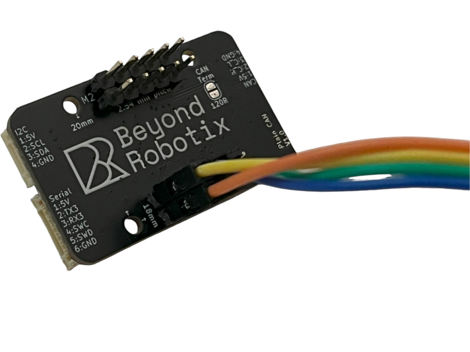 Debug header compatible with STLINK V3 Minie, the same interface used across BR products. Includes both SWD for breakpoint debuging, and a serial port for console access.
